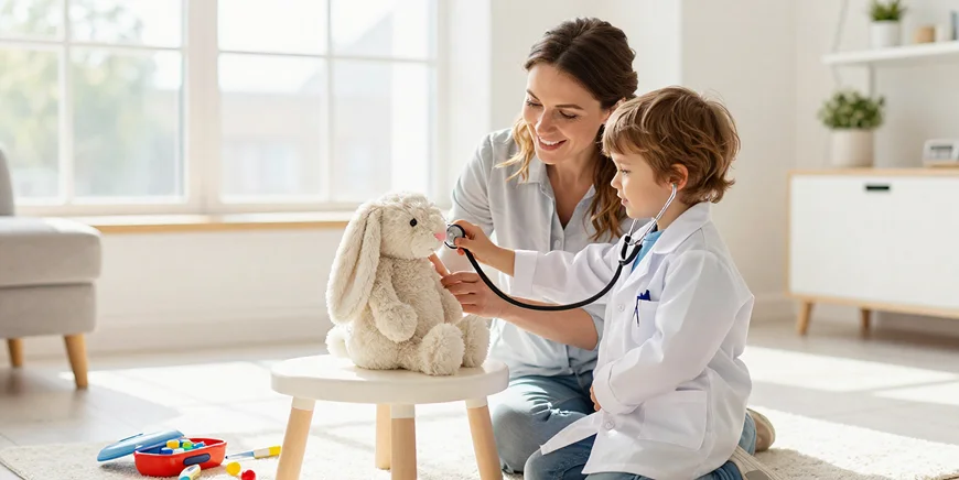 - Играйте в доктора. Пусть ребенок полечит игрушки, послушает плюшевого мишку фонендоскопом (подойдет игрушечный), поставит кукле градусник. Меняйтесь ролями: сегодня он врач, завтра — пациент. Игра дает ощущение контроля над ситуацией и снижает тревогу.