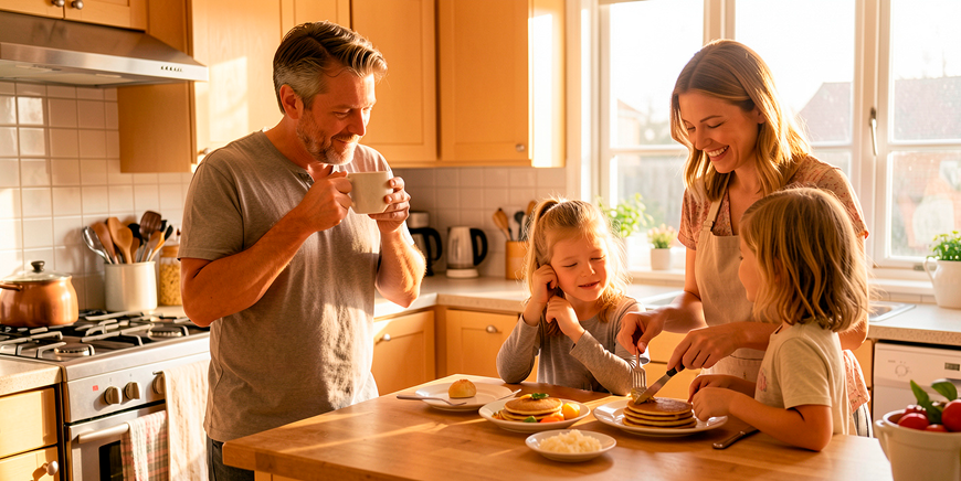 Дети копируют родителей. Если вы сами поздно ложитесь, с трудом встаете, пьете литрами кофе и ворчите по утрам — требовать от ребенка другого бесполезно. Начните с себя.